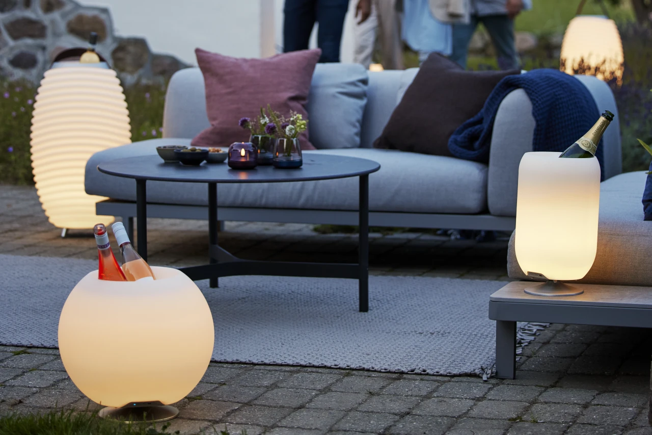 Découvrez toutes nos lampes haut-parleurs 3-en-1 avec refroidisseur de vin : Synergy, Atmos et Sphere. 100 % portable grâce à une batterie rechargeable intégrée. Apportez-la à l'extérieur ou profitez d'une fête spontanée. Vous pouvez y placer 1 ou 2 bouteilles (de vin), selon la taille et le modèle du produit. CONSEIL : utilisez les glaçons réutilisables Kooduu et ajoutez de l'eau pour que vos boissons restent froides pendant des heures.