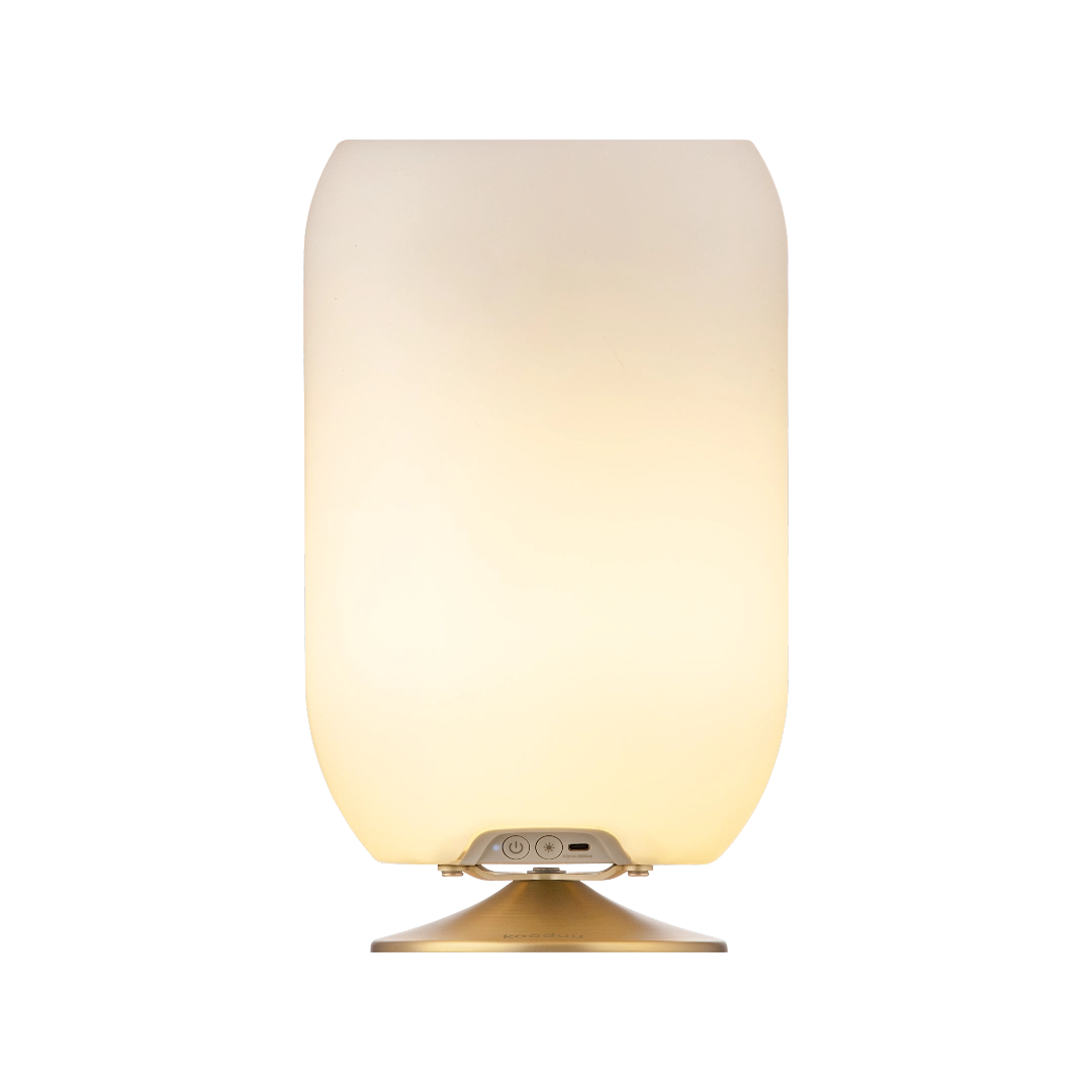 The Kooduu Atmos Brass combines the luxury of a lamp, the convenience of a drink holder, and the pleasure of a Bluetooth speaker in one chic cylindrical design.