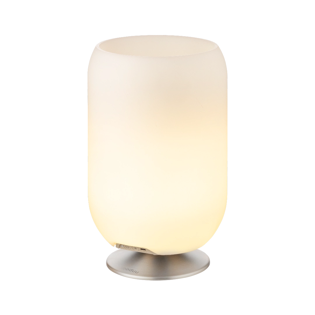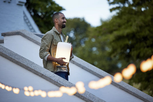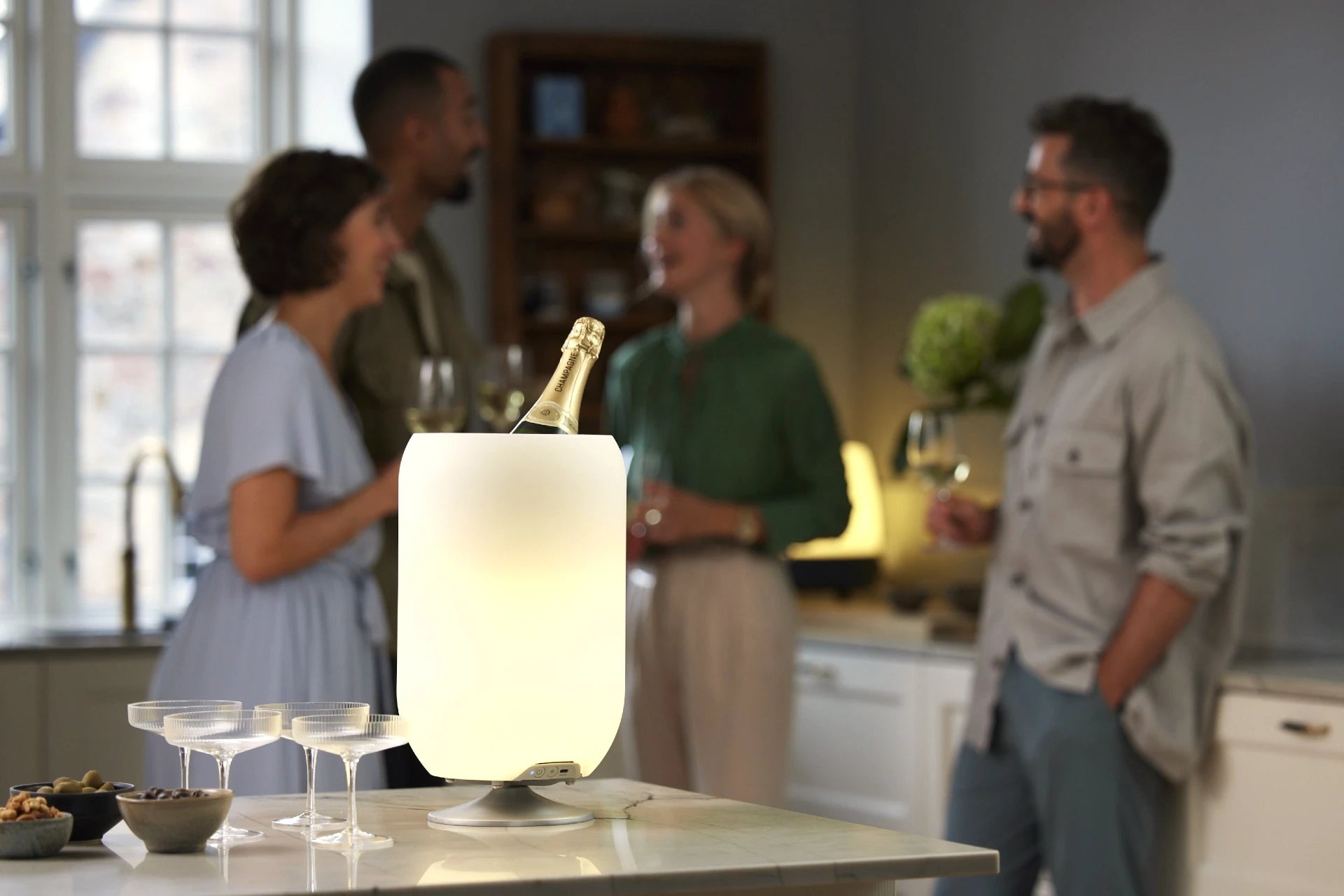 The Kooduu Atmos in Brushed Silver combines the luxury of a lamp, the convenience of a drink holder, and the pleasure of a Bluetooth speaker in one chic cylindrical design. Its small and convenient shape fits 2 regular bottles of wine and emits warm, dimmable light and clear sound thanks to its built-in Kooduu Bright Sound Technology™ module.